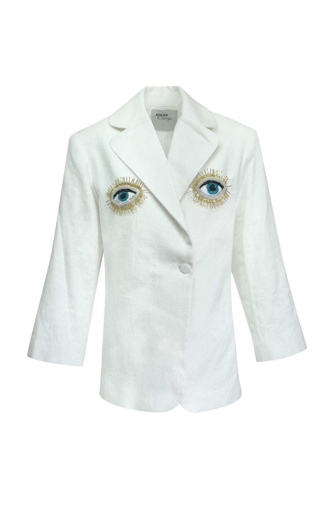 Oversized fit blazer made of cotton and linen, featuring hand-embroidered eye appliqués crafted by Colombian artisans. This statement piece will be the focal point of your look, thanks to its bold shoulder pads and unique embroidery. The model is wearing a size S and is 1.75 m tall. This garment is made in Colombia under ethical working conditions.