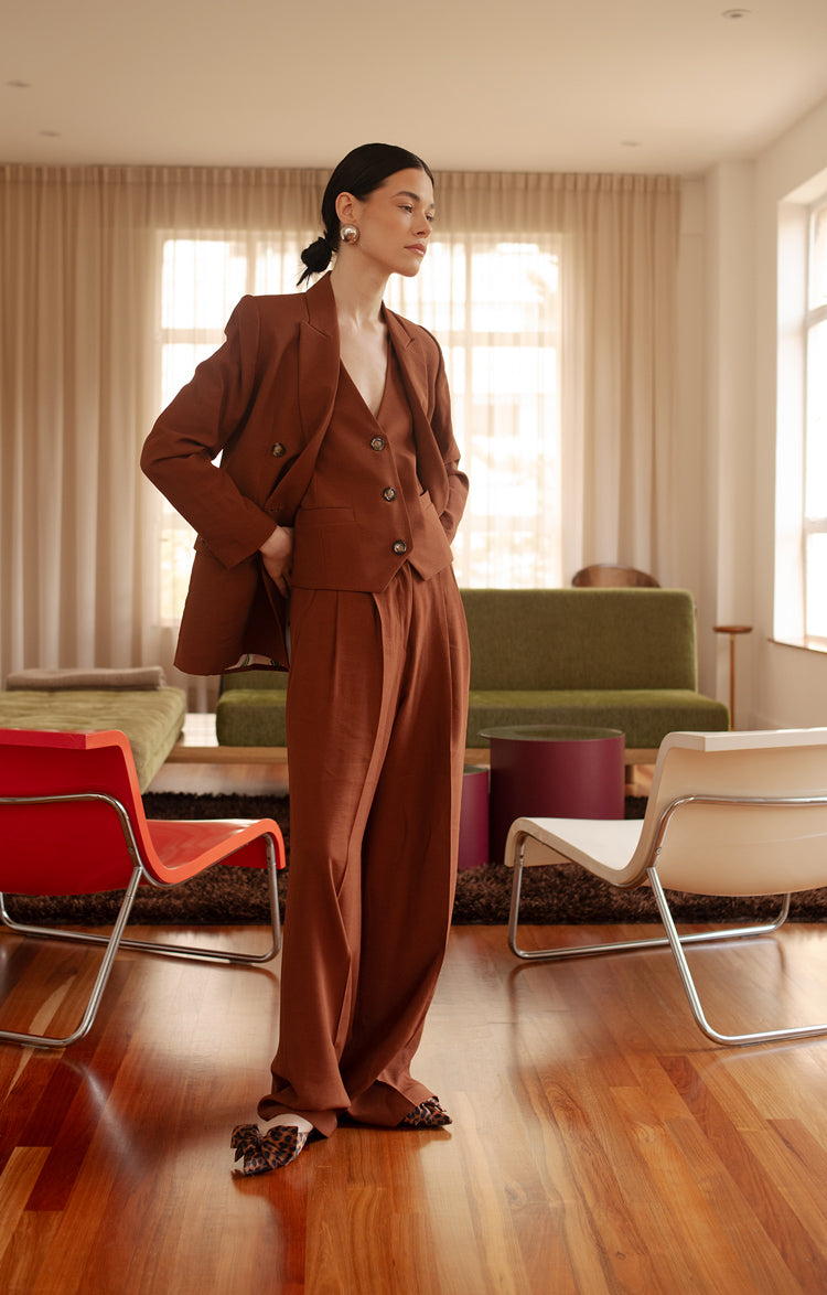 Wide leg, high-waisted tailored trousers with presses. Made out of cottony viscose with fluid feel. Ideal to impress on a special occasion. Pair with matching blazer for a power woman look. Model is 5' 7" and wears size S. This garment is made in Colombia under ethical manufacturing conditions.