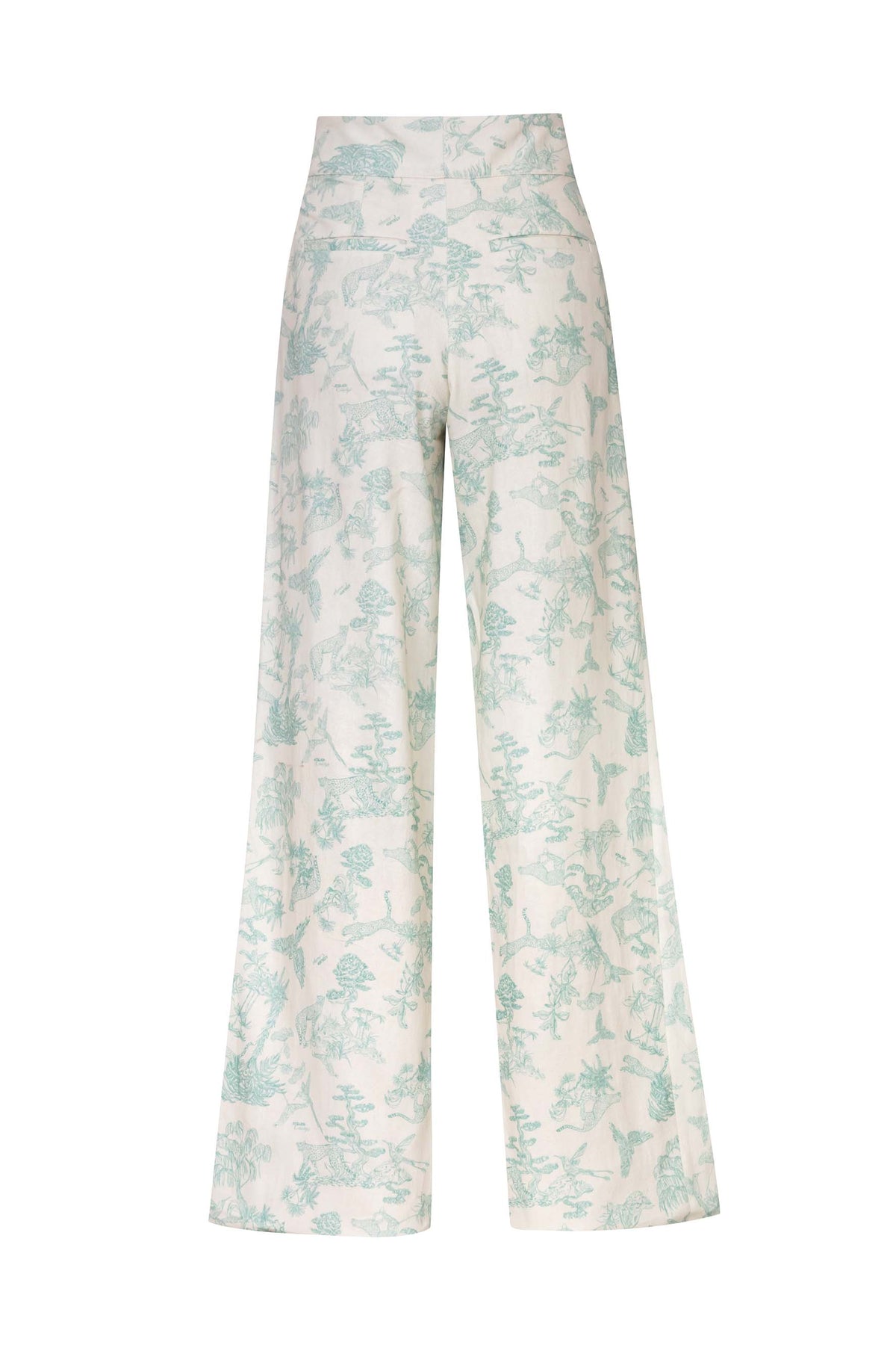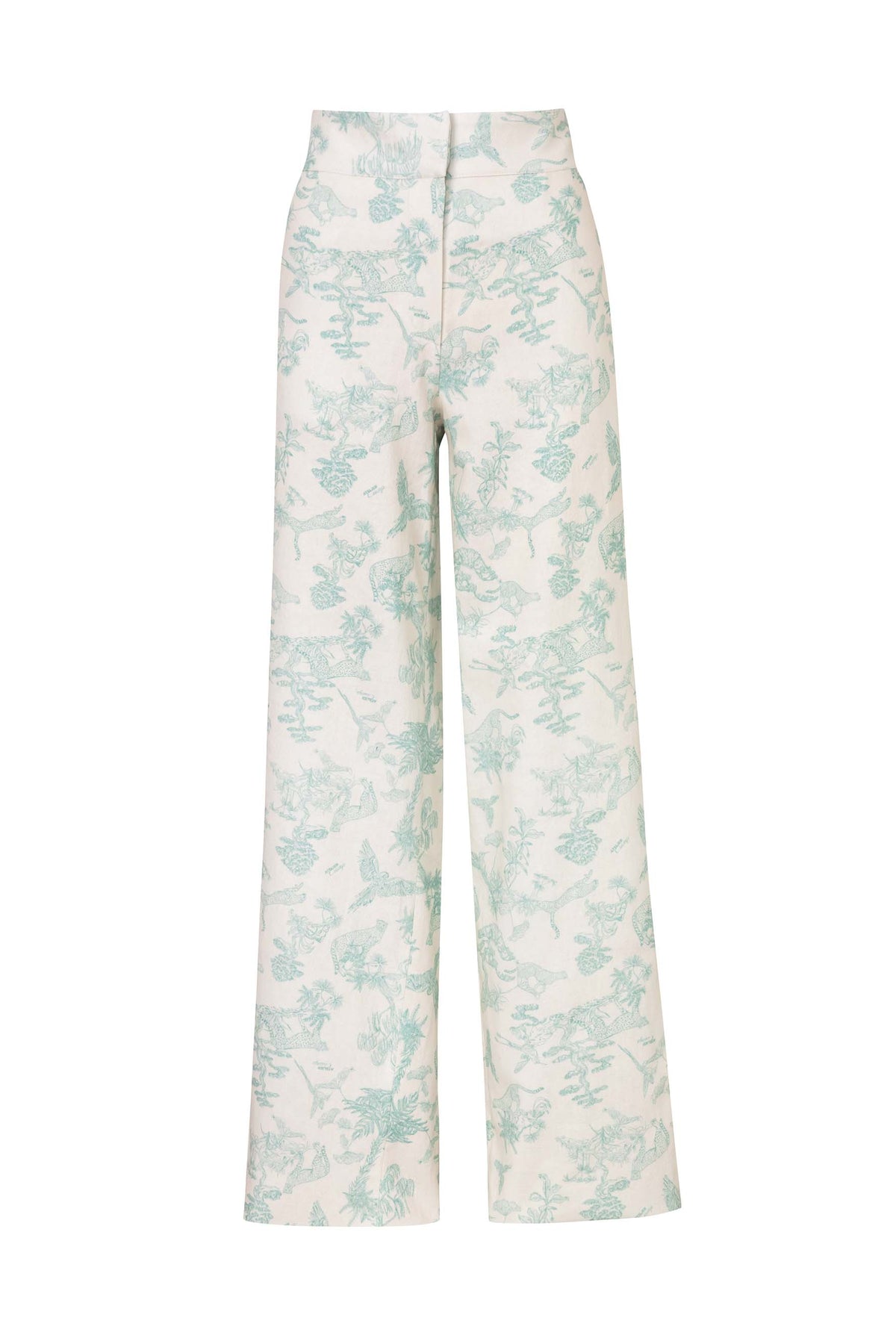Straight-leg pants made from 87% cotton and 13% linen. These pants are fresh and comfortable, featuring our signature toile de jouy print in mint green. You can pair them with basic pieces or as a set with our mint safari jacket. The model is 5'7" and wears size S. This garment is made in Colombia under ethical manufacturing conditions.