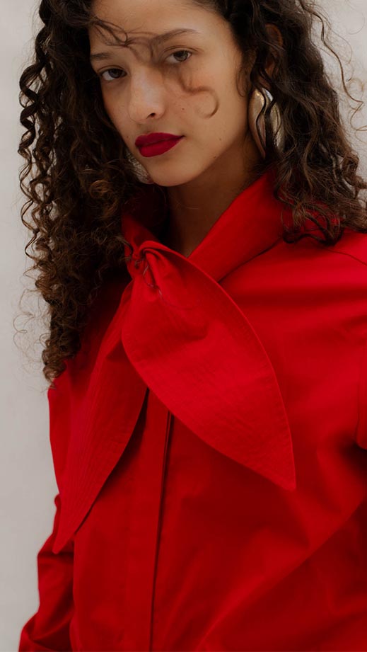 A knotted-collar shirt with a loose fit, it is cool and easy to pair with basic garments. The model is 5'7" and wears size S. This garment is made in Colombia under ethical manufacturing conditions.