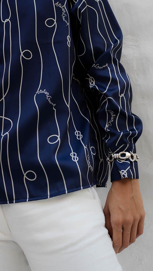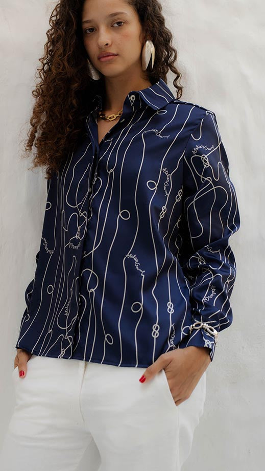 Long-sleeved shirt with a classic collar. It is a statement piece within the collection, with a distinctive rope print that stands out in the line, as well as the Atelier Crump logo. A sophisticated, flowing, fresh and fun garment. The model is 5'7" and wears size S. This garment is made in Colombia under ethical manufacturing conditions.