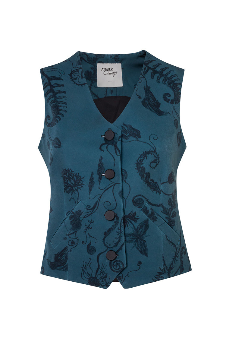 Classic V-cut vest, buttons covered in miyaki satin, made of a printed